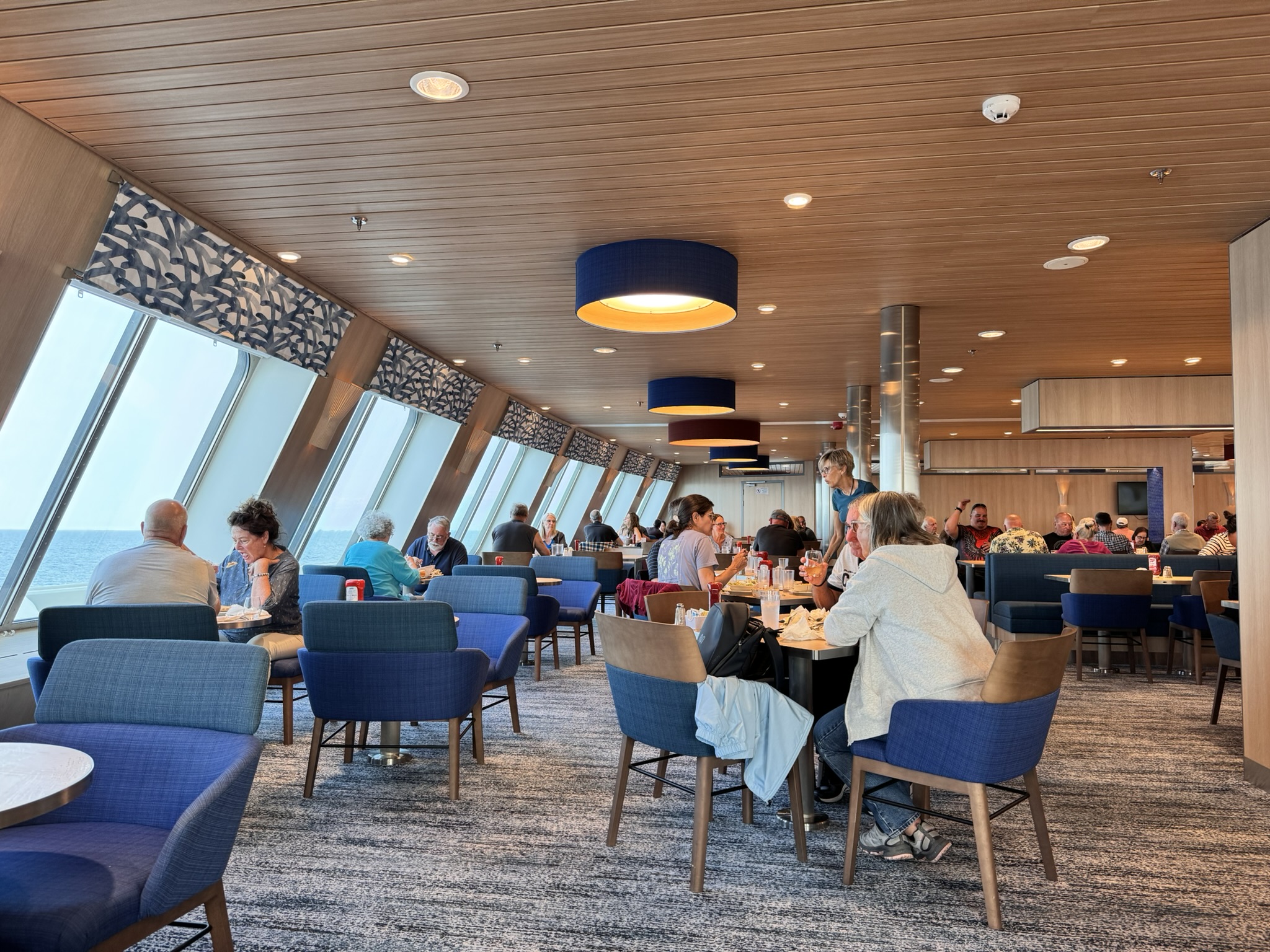 The general seating lounges are not as spaced out as the Argentia ferry, and the seats are older but still reclined. The lounges also have large TV screens playing pre-set television shows, news and sports. They didn’t turn them off overnight, so if flashing screens bother you, bring an eye mask for sleeping. Unless I were able to book a cabin, I likely wouldn’t choose an overnight trip on this route again.